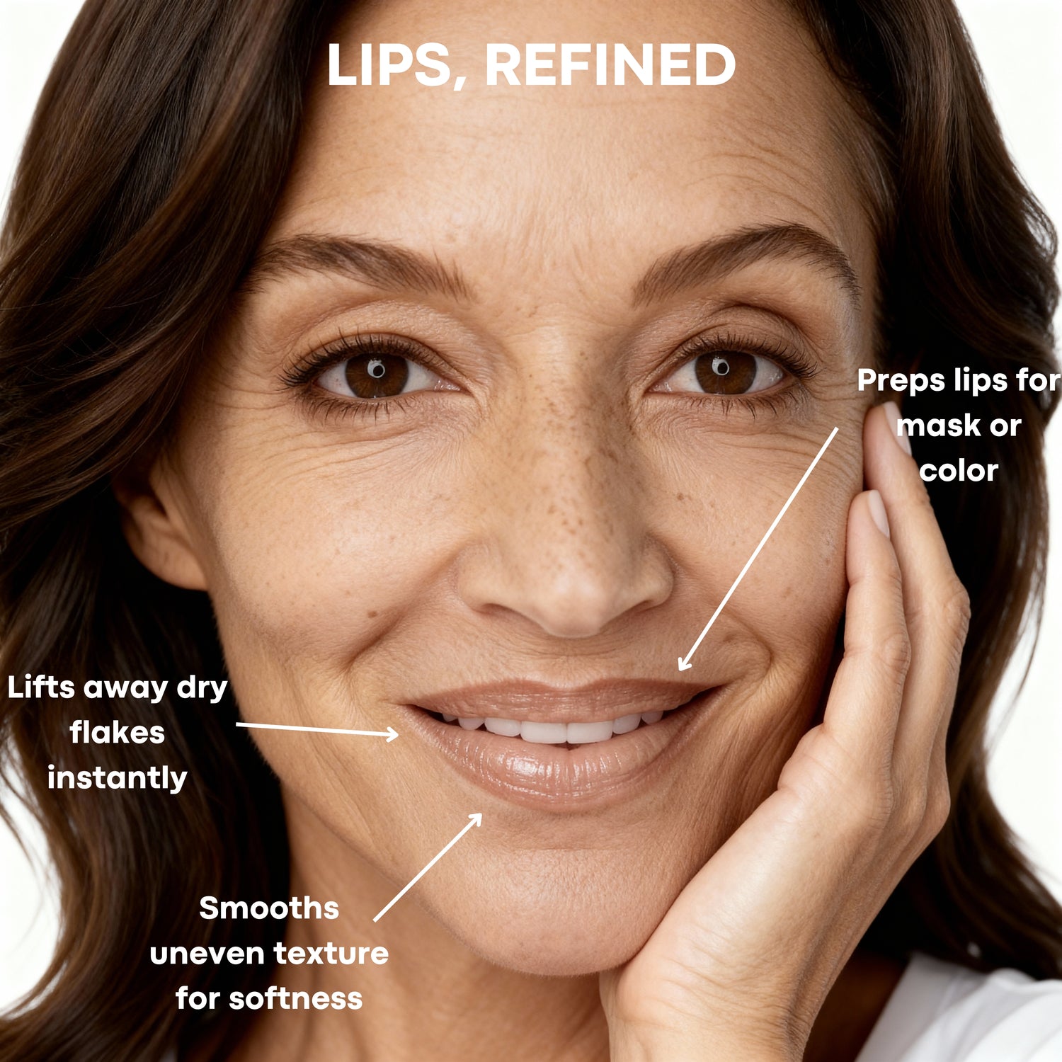The mineral polish lifts away dry flakes and smooths uneven texture, leaving lips instantly softer, comfortable, and naturally radiant.